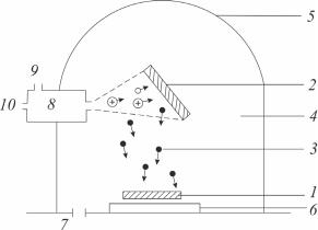 Рис. 6.13. Распыление ионным пучком при нанесении покрытий: 1 – образец; 2 – мишень или источник испарения; 3 – атомы мишени; 4 – высокий вакуум; 5 – стеклянный колпак вакуумной камеры; 6 – анод; 7 – к трубопроводу вакуумной откачки; 8 – ионная пушка; 9 – напуск инертного газа; 10 – к высоковольтному источнику питания