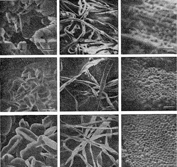 Рис. 6.14. Сравнение изображений поверхности диэлектриков без покрытия и с покрытием, полученным термическим испарением и катодным распылением: Аl2O3 (слева); хлопковые волокна (в центре); латексные сферы из полистирола (справа). Верхний ряд без покрытия, средний ряд – покрытие из золота толщиной 10 нм, нанесено термическим испарением, нижний ряд – покрытие из золота толщиной 10 нм, нанесено катодным распылением; маркер 1 мкм