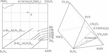 Рис. 2.6. Расположение сиалоновых фаз на диаграмме состояния: а – четырехэлементной системы Si-Al-O-N; б – пятиэлементной системы Y-Si-Al-O-N