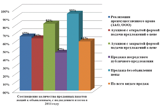 Количество непроданных пакетов акций в 2011 году со 100% участием государства составило 73%. Этот показатель превышает количество проданных пакетов с аналогичным участием государства. Другая ситуация с пакетами акций с долей участия государства от 25% до 50%, а также менее 25%, количество реализованных на торгах превышает количество аналогичных пакетов несостоявшихся продаж, что показывает рост интереса владельцев пакетов предприятий и частных инвесторов к блокирующим пакетам акций этих предприятий.