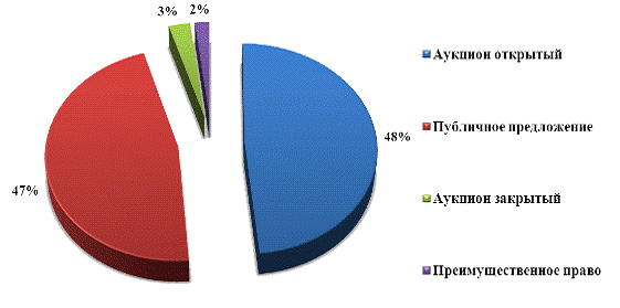 Из рисунка 2.2 следует, что самыми результативными, имея ввиду положительный результат продажи, оказались и продажи без объявления цены (из 19 продаж состоялись 18) и закрытые аукционы, самый низкий показатель (46,7%) - у продаж посредством публичного предложения. Средняя по всем способам результативность составила 60,5%.