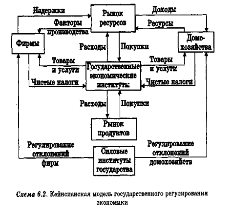 Кейнсианская модель предполагает активное и по возможности максимально допустимое вмешательство государства в экономику с целью минимизации циклических колебаний, приводящих к потерям ресурсов и продуктов всех участников рынка.