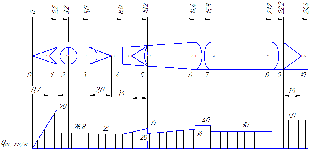 Вычислим внутренние усилия в сечения корпуса ЛА, схема которого изображена на рисунке 1.
