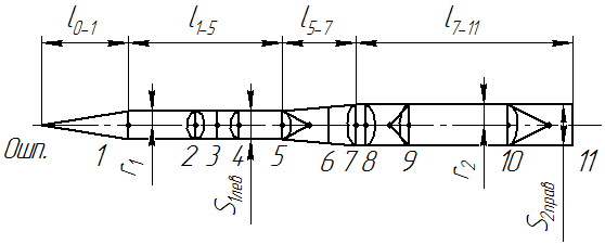 Рисунок 8 – Схема ЛА с обозначением расположения участков и оснований конусов