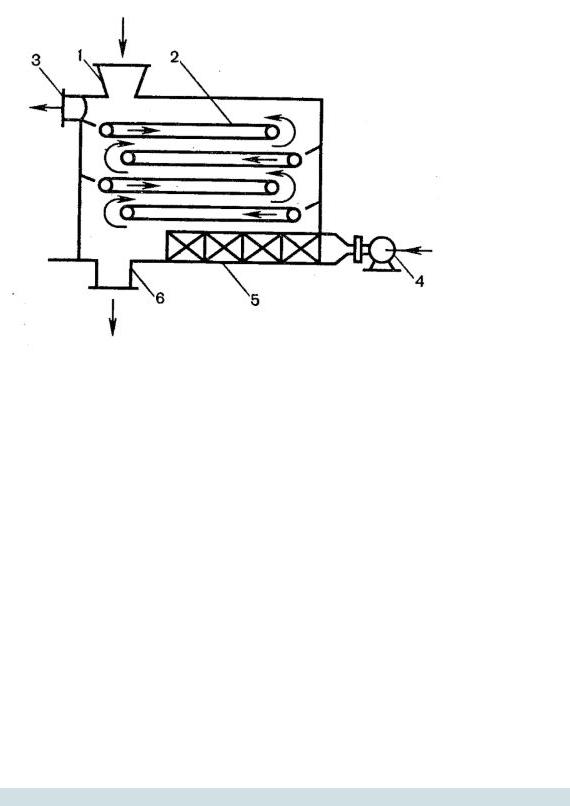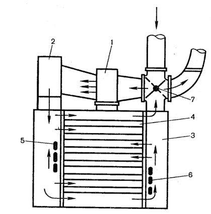 (3) сушилки и проходит в горизонтальном направлении между полками (4) с высушиваемым материалом. Воздух в камере движется зигзагообразно через три зоны, дважды меняя направление своего движения и дополнительно нагреваясь воздухонагревателями (5), (6). Насыщенный водяными парами отработанный воздух выводится через верхнюю часть камеры. С помощью шибера (7) (заслонки) часть теплого, влажного отработанного воздуха смешивается со свежим воздухом, полученная смесь нагревается и подается в сушилку. Частичная рециркуляция и промежуточный подогрев воздуха в камере рекомендуется для осуществления более равномерного и мягкого режима сушки материала и снижения расхода воздуха и тепла.