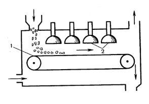 На рис. представлена схема ламповой радиационной сушилки. Над поверхностью высушиваемого материала, например влажного гранулята, перемещаемого транспортером (1), устанавливают осветитель-ные лампы с отражателями (2), направляющими интенсивный поток лучей на поверхность материала. Тепловое действие инфракрасных лучей вызывает быстрое испарение влаги из поверхностного слоя материала.