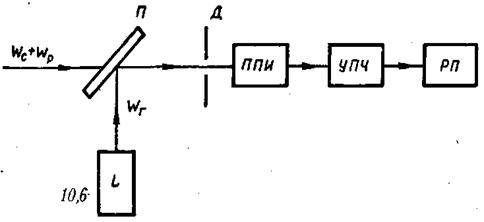 Wс - мощность сигнала; Wг и Wр - мощности гетеродина (лазера L) и радиационного шума; П - полупрозрачная пластинка; Д - диафрагма; УПЧ - усилитель промежуточной частоты; РП - регистрирующий прибор;