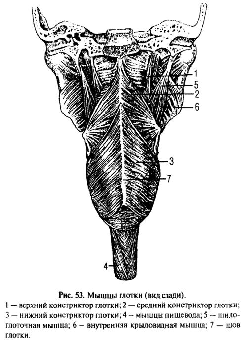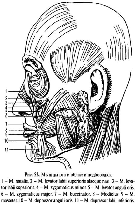 Губы и щеки не являются только пассивным механическим препятствием к выпадению пищи из полости рта. За счет своих мышц они отделяют определенные количества пищи, помогают формировать пищевой комок, активно перемещают его во рту и подкладывают под разжевывающие ее зубы. В этом им помогает язык, мышцы которого, начинаясь от нижней челюсти и подъязычной кости, непосредственно принимают участие в жевании и глотании. Небезучастными остаются и мышцы мягкого неба. Пища рефлекторно вызывает слюноотделение, а в активном выдавливании слюны из слюнных желез принимают участие окружающие их мышцы или непосредственно, или через натяжение связанных с ними фасций. Таким образом, и мышцы шеи принимают участие в акте еды. Кроме того, фиксируя череп или подъязычную кость, они препятствуют их смещению при жевании. Например, челюстно-подъязычная мышца, m. mylohyoideus, не могла бы опустить нижнюю челюсть, если бы сама подъязычная кость в этот момент не фиксировалась на месте мышцами шеи, лежащими ниже ее.