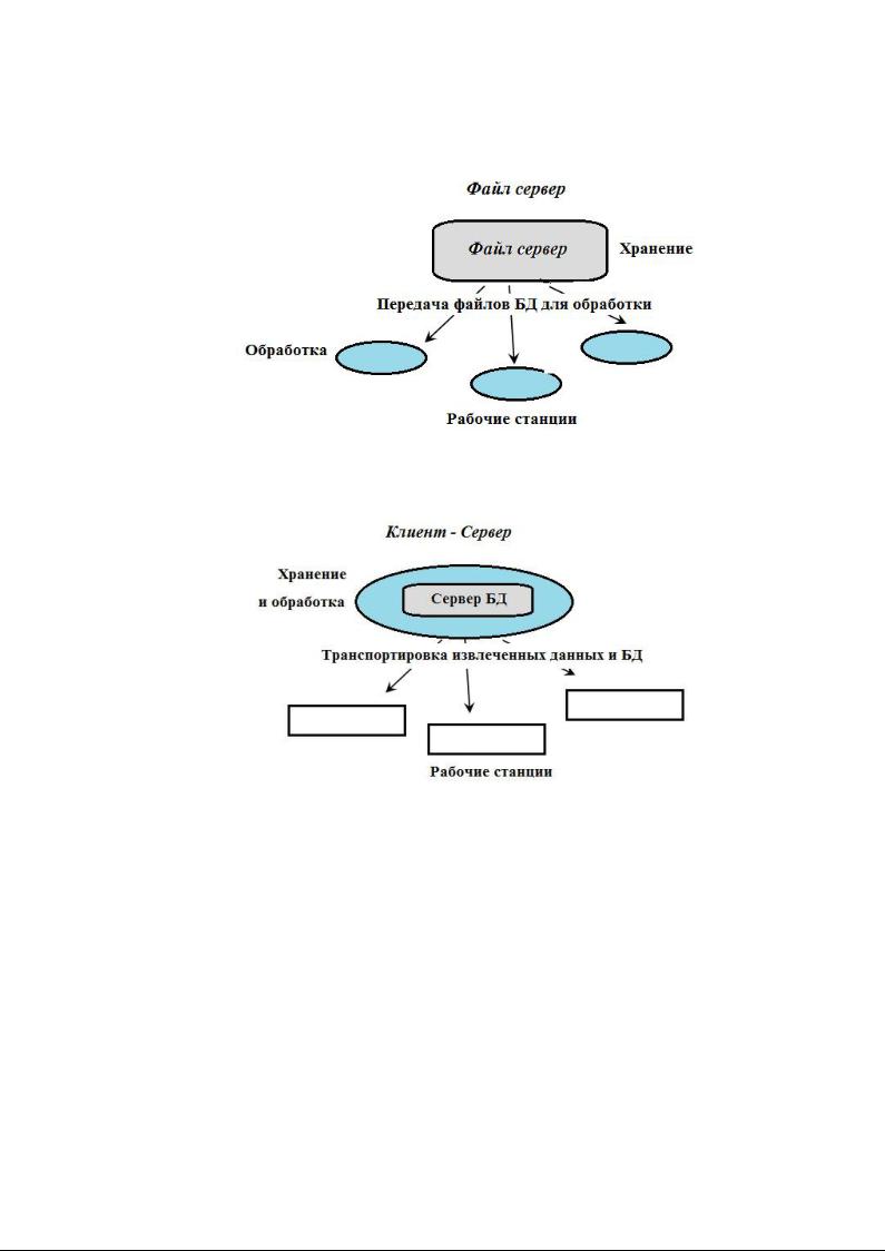 Архитектура «файл-сервер» предполагает выделение одной из машин сети в качестве центральной (сервер файлов). На ней хранится совместно используемая централизованная БД. Все другие машины сети являются рабочими станциями. Файлы БД в соответствии с пользовательскими запросами передаются на рабочие станции, где и производится обработка. При большой интенсивности доступа к одним и тем же данным производительность системы падает.