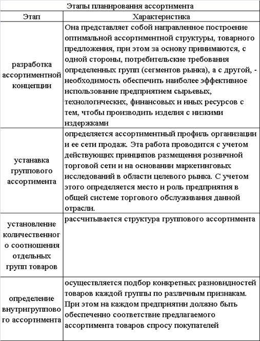 Таким образом, планирование ассортимента продукции является важной частью общей политики предприятия, которая отвечает за отбор и оценку товара, его анализ и контроль выполения.