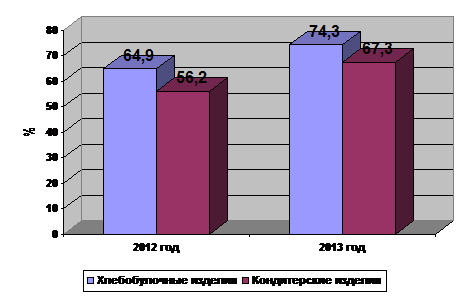 По выпуску булочных и сдобных изделий ЗАО «Хлеб» находится на первом месте, его удельный вес в общем объеме производства булочных и сдобных изделий составил по хлебобулочным видам - 74,3%, по кондитерским - 67,3% , что на 9,4% и 11,2% соответственно больше, чем в 2012 году (рис. 2.1.3).