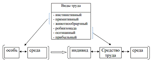 К самому первому виду труда классики марксизма относят «инстинктивный труд» или, как его назвал в своих работах В.И.Ленин, «животнообразный труд» [1]. Его отличительная черта состоит в том, что происходит непосредственное взаимодействие человека с окружающей средой, как «обмен веществ между ними», характеризуемой для ранней стадии схемой «особь - среда», для более позднего периода - «индивид - орудие - среда».