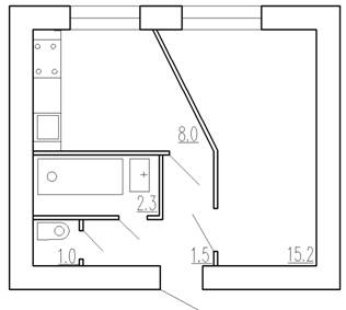 В ходе перепланировки было перенесена стена кухни, вследствие чего кухня стала площадью 8,0 кв.м, коридор 1,5 кв.м., жилая комната 15,2 кв.м. и санузел сделали раздельным, в итоге ванна стала площадью 2,3 кв.м., а туалет 1 кв.м. . Сделан ремонт, оконные рамы заменены на стеклопакеты.