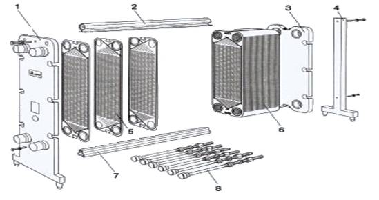 Рама теплообменника (Рисунок 1.1) состоит из неподвижной плиты (1), стойки (4), верхней (2) и нижней (7) направляющих, подвижной плиты (3) и комплекта стяжных болтов (8).