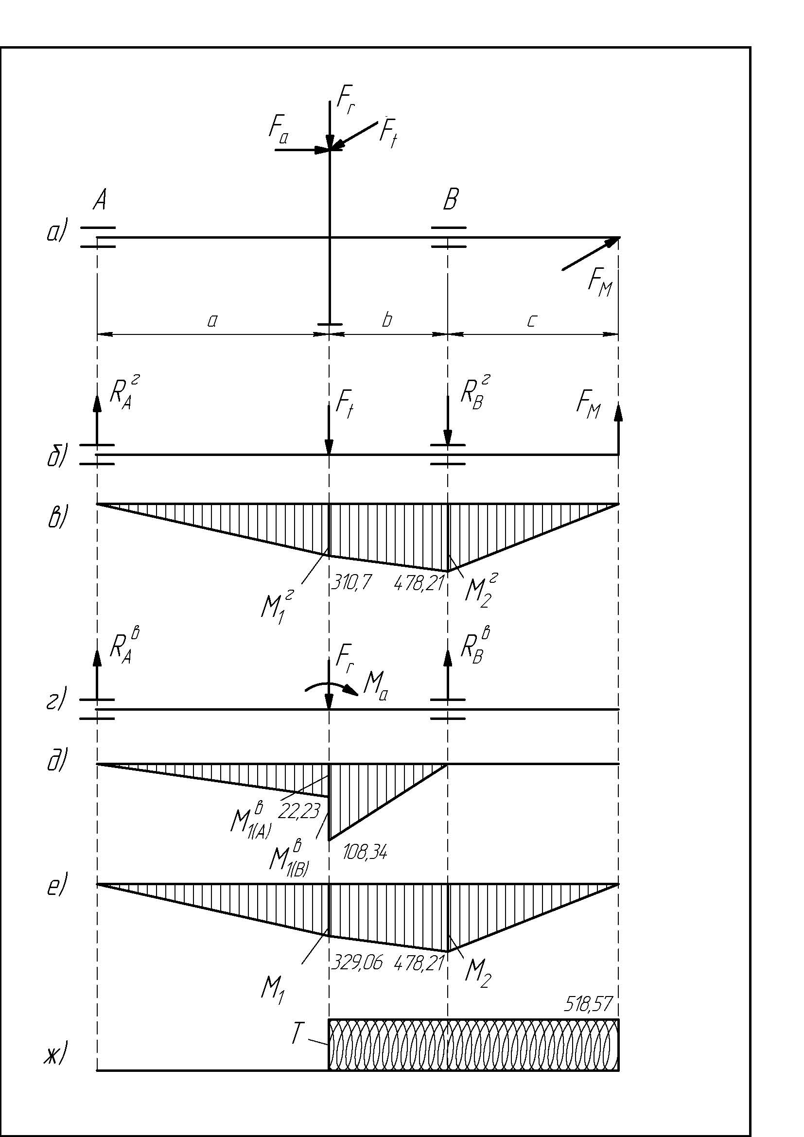 Так как внешние нагрузки, действующие на вал расположены в различных плоскостях составляем расчётные схемы для вала в горизонтальной плоскости (рисунок 3.1, б) и вертикальной плоскости (рисунок 3.1, г). Для каждой расчётной схемы определяем реакции опор и строим эпюры изгибающих моментов.