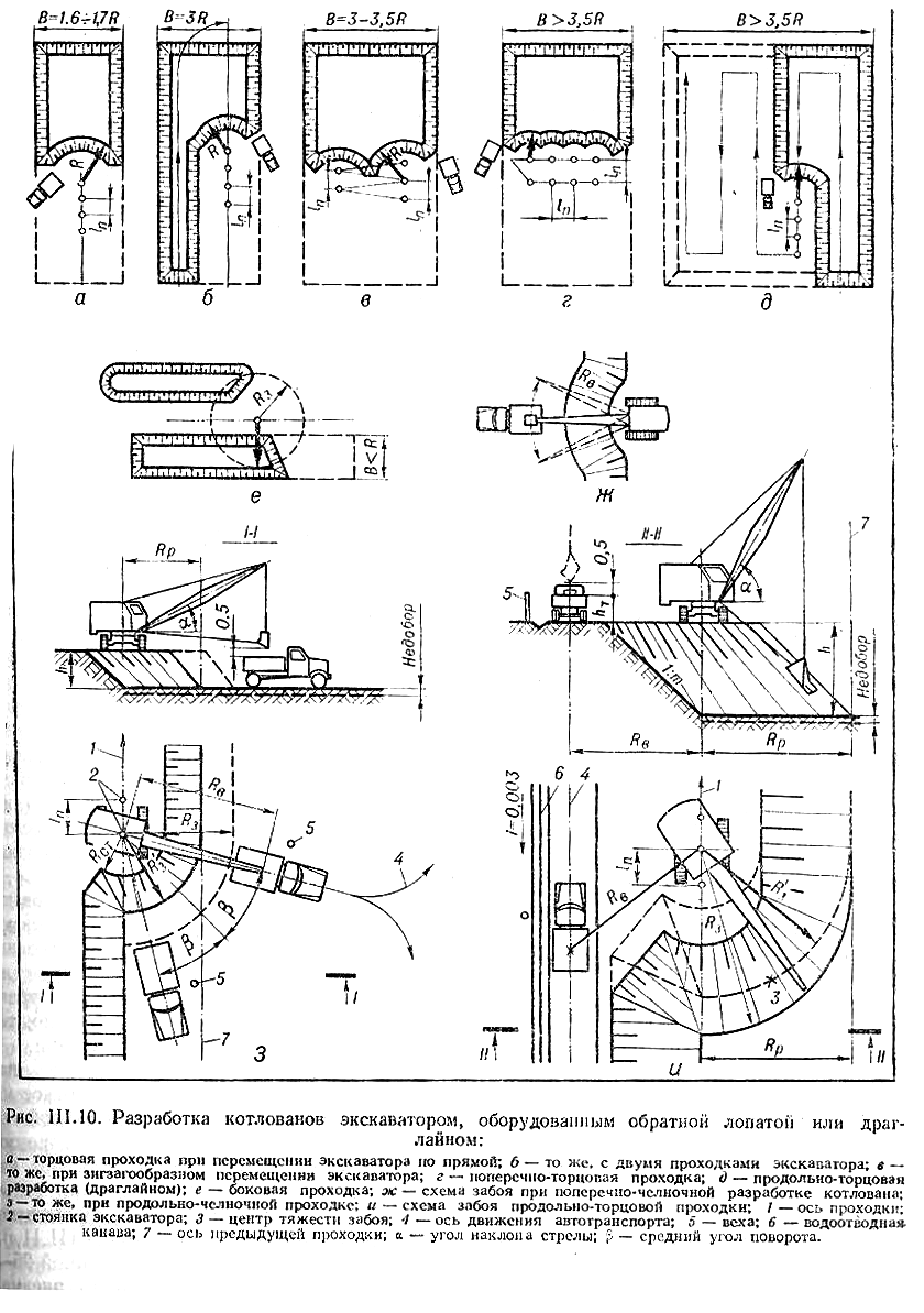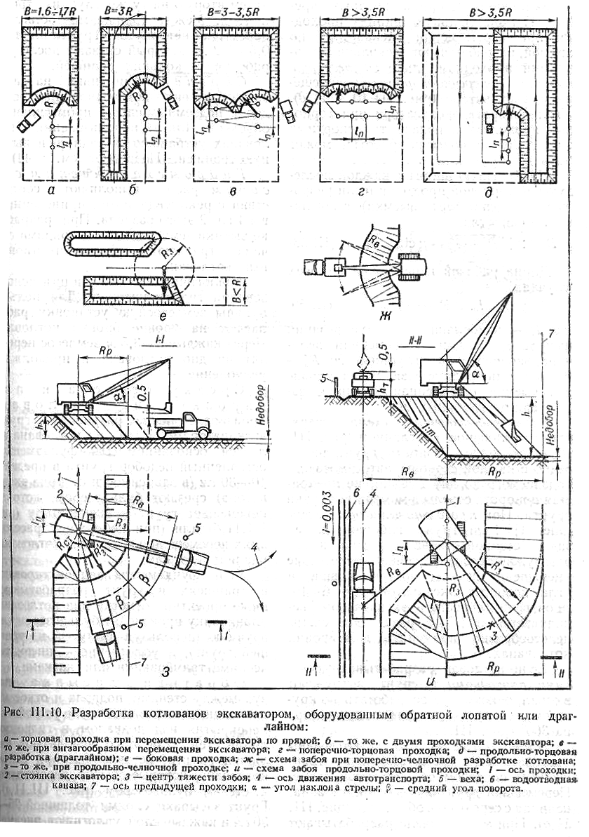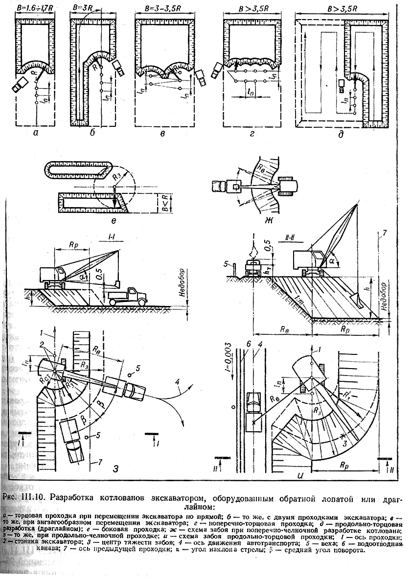 Рис.14. Разработка котлованов экскаватором, оборудованным обратной лопатой или драглайном: а – торцевая проходка при перемещении экскаватора по прямой; б – то же, с двумя проходками; в – то же, при зигзагообразном перемещении экскаватора; г – поперечно-торцевая проходка; д- продольно-торцевая (драглайном).