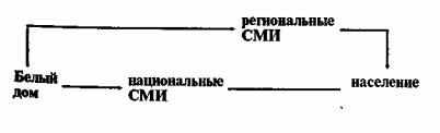 Мы выделяем в качестве отдельного аспекта также и коммуникативные модели, поскольку точный выбор в этой области столь же значим. У нас всегда есть то или иное альтернативное решение. Однако выбирая его, нам придется отбрасывать остальные, обуславливая это определенными причинами. Можно привести следующие примеры. В одной из предвыборных кампаний по выборам президента США, проводя встречи кандидата с журналистами в телестудии, было обнаружено, что имеется расхождение между интересами журналистов и рядовых жителей, т.е. журналисты могли задавать не те вопросы, которые интересовали жителей. Даже минимальное различие такого рода не ведет к повышению эффективности воздействия, по этой причине журналисты в студии были заменены рядовыми жителями. Мы имеем в этом случае два вида аудитории: промежуточная и целевая. Журналисты интересуют нас исключительно в качестве "канала" выхода на реальную цель — жителей. Сходная ситуация возникла и при работе со столичными журналистами в Вашингтоне. При точке зрения, что журналист — это канал, а не реальная цель, возникла идея поиска механизмов непосредственного выхода на региональные СМИ, минуя столичных журналистов. Образуются следующие две схемы продвижения сообщений: