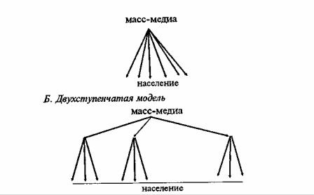 Следует отметить принятую в рамках теории коммуникации двухступенчатую модель. На первых этапах модель воздействия была одноступенчатой. Считалось, что масс-медиа непосредственно воздействуют на аудиторию. Но проведенные эксперименты показали, что это не так. Один из них показал, что степень воздействия через две недели после получения сообщения не упала, а возросла. Когда стали разбираться в причинах, то выяснили, что к этому привело обсуждение полученных сообщений с так называемыми "лидерами мнения". Эти два варианта воздействия представимы в следующем виде.