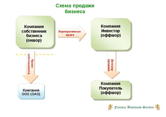 Насамперед, нерезидент - оншорна компанія (компанія в низькоподатковій зоні на Кіпрі, Великобританії, Швейцарії, Данії…) здобуває 100% корпоративних прав ТОВ або пакет акцій. Тим самим компанія стає власником української компанії. Причому, слід зазначити, що для забезпечення конфіденційності акціонером оншорної компанії виступає офшорна компанія (Гібралтар, Панама, Беліз, …). Після чого компанія продає бізнес компанії покупцеві згідно договору. Можливий варіант продажу корпоративних прав (акцій) оншорною компанією іншій компанії-нерезиденту