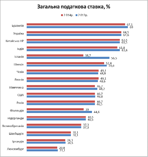 Серед країн світу Швейцарія посідає місце за рівнем загального відсотку по податковим ставкам (див. рис. 1). В Швейцарії загальний рівень податків складає 30,1 %, тоді як в Україні податковий тягар вдвічі більший, він у 2013 році складає 64,5 %, у 2014 - 64,6 % [2].