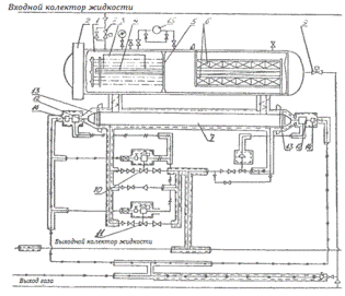 Десорбер - массообменных колонна насадочного или тарелчатого типа. При диаметре колонны до 600 мм десорбер засыпают насадкой, выше 600 мм - оборудуют 14-18 - колпачковыми тарелками. Жидкость вводят в середину колоны. В нижнюю часть колонны подводят тепло выносным испарителем (рибойлером), где носитель нагревается нагревателем керосином или водяным паром. Наверх десорбера подают орошение - конденсат водяных паров, выделяющихся при регенерации растворов. Десорберы рассчитывают графически или аналитически по методу Крейсера . Выветривали обеспечивают нормальный переток жидкости из контактора через теплообменники в десорбер. Выветриватели устанавливают между первым и вторым теплообмениками. Теплообменник - устройство, в котором осуществляется теплообмен между двумя или несколькими теплоносителями. На установках небольшой производительности по газу применяют теплообменники конструкции "труба в трубе", а на установках большой производительности - кожухотрубчатые теплообменники.