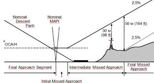 Если до пролета МАР не был установлен необходимый визуальный контакт с ориентирами, схема предусматривает немедленное осуществление ухода на второй круг во избежание столкновения с препятствиями.