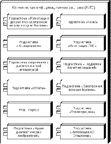 Клиническая информационная система (КИС) (рис. 4.6) предназначена для мониторинга лечебно-диагностического процесса, обеспечивающая ведение клинических записей о пациенте, а также их просмотра, обработки и анализа. Формирующаяся при этом электронная история болезни содержит план диагностических мероприятий и план лечения, записи опроса и осмотра пациента, назначения, протоколы консультаций, дневниковые записи и записи о результатах проведения тех или иных диагностических мероприятий, историю постановки диагноза и т.д.