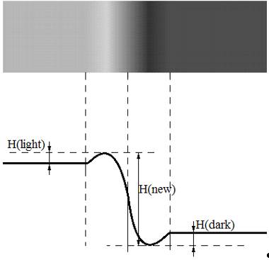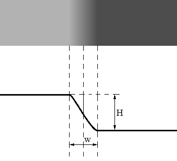 Резкость изображения зависит от величины перепада яркости между областями (W), образующими его контуры, и от резкости изменения этого перепада (H).
