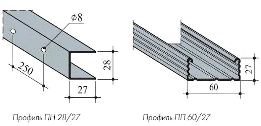 Потолочный направляющий профиль (ПН 28/27) имеет С-образную форму и служит в качестве направляющего для потолочного профиля. Монтируется в паре с соответствующим по размеру потолочным профилем (ПП 60/27). Потолочный направляющий профиль (ПН 28/27) производится с готовыми отверстиями 8 мм в стенке профиля для крепления его к несущему основанию. Потолочный профиль (ПП 60/27) имеет С-образную форму и служит для формирования каркаса подвесных потолков с облицовкой гипсокартонными листами.
