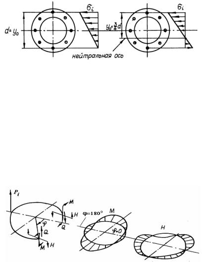 Расчет внутренних усилий в шпангоуте проводится для каждой из сил, создаваемых единичным болтом, а затем результаты суммируются в каждом сечении. На рис. 35 показаны направления внутреннего изгибающего момента М, крутящего Н и перерезывающей силы Q, возникающих в сечении шпангоута под действием сосредоточенной силы Pi . Там же приводятся их эпюры в зависимости от угла ϕ. Расчет внутренних усилий ведётся по