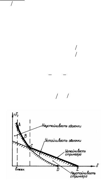 элемент, а между кривыми – один из них. Выше линии ABCЕ устойчивы стрингеры и оболочка. Точка E на этой линии соответствует случаю, когда стрингеры отсутствуют и отсек гладкий и имеет толщину δ = (а