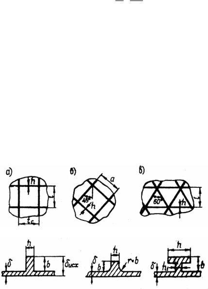Наиболее точные, но и более трудоемкие оболочки получаются при механическом фрезеровании. При этом используется продольно-кольцевое (рис. 49,а), перекрестное (б) или перекрест- но-кольцевое расположение ребер (в). На рис. 50 показаны формы наиболее распространенных сечений ребер, применяемых в вафельных отсеках. Экспериментально установлено [18],
