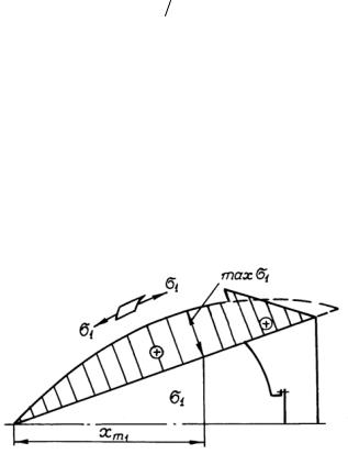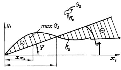 Исследуя выражение (1.25) на экстремум, получаем, что максимальные меридиональные напряжения возникают на расстоянии от носка, равном: