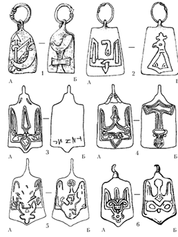 Святослава Ігоровича (А), Псков; 3 - тризуб Володимира Святославича (А),