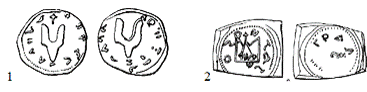 - XI ст.: 1 - срібник князя Володимира Святославича тип I, №32-1; 2 - срібник