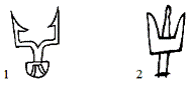 предметах з Новгороду: 1 - стилізований двозуб на дерев’яному предметі з 28-го
