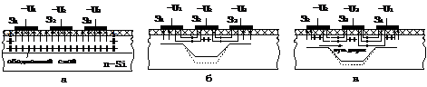 Пусть на затворах З1 и З3 (рис. 12, б) действуют напряжения - U1 и U3, а на среднем, более отрицательное - U2. Тогда на границах З2 образуются ЭП, препятствующие перемещению положительных зарядов - дырок из-под этого затвора. Поэтому, если под З2 создать тем или иным путем зарядовый пакет дырок, то он будет сохраняться в этой области длительное время.