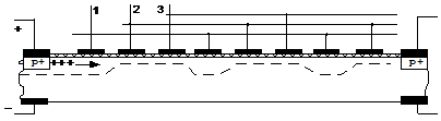 один из способов ввода и вывода неравновесного дырочного заряда с помощью р-n-переходов. Напряжение фаз 1, 2 и 3