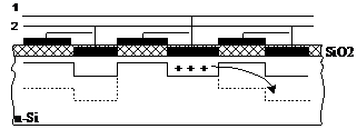 Каждый МДП-элемент содержит два соединенных между собой затвора: один «скрытый» - кремниевый, другой обычный алюминиевый, расположенный на поверхности оксидного слоя. Поскольку кремниевые затворы расположены ближе к полупроводниковому материалу, чем алюминиевые, глубина обедненного слоя оказывается разной в пределах одного элемента. Такая разница сохраняется и в режиме записи (см. штриховую линию на рис. 14). Именно поэтому переместившийся заряд не может вернуться к предыдущему элементу, несмотря на двухфазное питание. Особенности данной структуры обеспечивают более высокие плотность компонентов и степень их интеграции, а также большее быстродействие fмакс = 20-50 МГц.