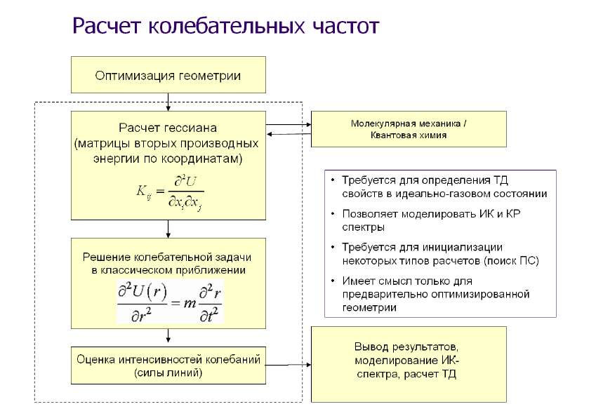 Расчет колебательных частот (в англоязычной литературе обычно используются термины Frequency calculation или Hessian calculation), как уже говорилось выше, важен сразу для нескольких целей: (1) установления типа стационарных точек; (2) описание ИК и КР спектра молекул; (3) расчета термодинамических свойств вещества. Кроме того, его повторное или даже многократное выполнение часто необходимо в процессе поиска переходных состояний и путей реакции, которые будут описаны ниже.