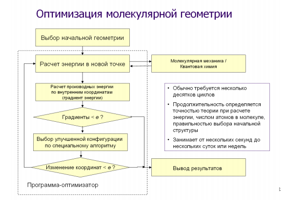 Оптимизация молекулярной геометрии (Geometry optimization) позволяет изучить структуру молекулы и ее энергию в свободном состоянии (в вакууме). Процесс оптимизации состоит в повторном (многократном) вычислении волновой функции и энергии молекулы и вариации структурных параметров так, чтобы достичь структуры, соответствующей минимуму полной энергии молекулы.
