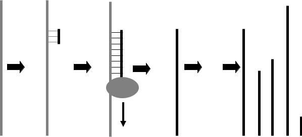 Рис. 9. Схема реакции обратной транскрипции: присоединение к цепи РНК рэндом-праймера в случайной позиции; достройка комплементарной цепи ДНК с участием обратной транскриптазы (ОТ). Так как точка присоединения рэндом праймера является случайной, в реакции образуются нити ДНК разной длины: от полноразмерных копий до очень коротких фрагментов.
