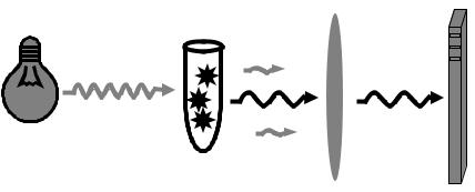 Общий принцип работы детектирующего амплификатора выглядит следующим образом. В детектирующей камере есть галогеновая лампа, которая является источником ультрафиолета. Свет этой лампы падает на пробирку, и флуорофор в реакционной смеси начинает излучать свет другой длины волны, который падает на светочувствительную матрицу, фиксирующую интенсивность излучения. Между матрицей и пробиркой находится светофильтр, который пропускает лишь излучение от флуоресцирующего красителя и «отсекает» излучение с другой длиной волны (рис. 11).