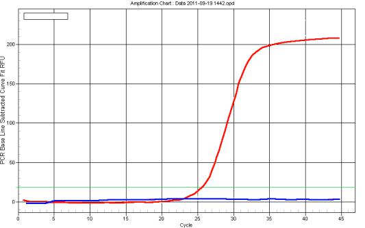 Рис. 12. Кривая флуоресценции, полученная в ходе ПЦР «в реальном времени». Логарифмическая кривая отражает увеличения уровня флуоресценции вследствие накопление ампликонов (положительный результат реакции), горизонтальная кривая – отсутствие увеличения уровня флуоресценции (отрицательный результат).