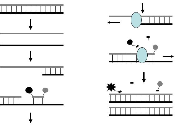 На рисунке 15 представлена схема ПЦР с использованием разрушаемой пробы. Ампликон подвергается денатурации, после чего на стадии отжига к образовавшимся одноцепочечным молекулам присоединяются затравочные праймеры; к одной из цепей присоединяется также проба. На стадии элонгации ДНК-полимеразы достраивают комплементарные цепочки ДНК. За счет наличия у ДНК-полимеразы экзонуклеазной активности, она разрушает пробу, что приводит к разобщению флуорофора и гасителя. Высвободившийся флуорофор восстанавливает способность давать излучение.