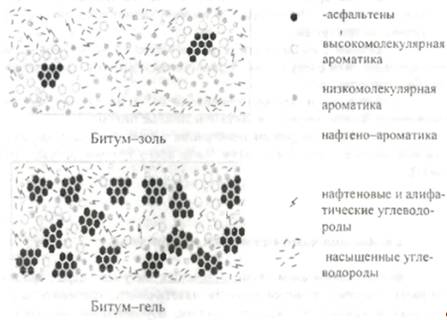 Структура битума (золь или гель) определяется степенью пептизации асфальтенов и зависит от относительного содержания в битуме ароматических углеводородов с алифатическими цепями различной длины [33].
