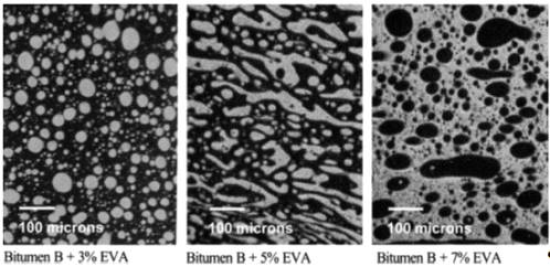 После того, как сополимеры ЭВА добавлены в битум, светлые компоненты битума обычно пополняются сополимерами. При низких концентрациях ЭВА, дисперсная ЭВА-обогащенная фаза может наблюдаться одновременно с битумной фазой [103]. По мере увеличения концентрации ЭВА, инверсии фаз происходит в модифицированном битуме и ЭВА-фаза переходит в непрерывную фазу. Процесс инверсии фаз модифицированного битума был представлен в виде флуоресцентного изображения на рис. 9 [161]. Если в модифицированном битуме существуют две непрерывные фазы, то его свойства могут быть существенно улучшены. ЭВА, как было установлено, образует жесткую сеть в модифицированном битуме и противостоит деформации [47], что означает, что ЭВА модифицированный битум обладает повышенной устойчивостью к образованию колеи при высоких температурах.