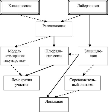 Взаимовлияние исторических форм демократии и различных теоретических схем показано на схеме 1.