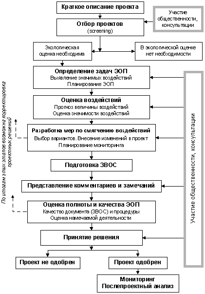 Послепроектные стадии. Накопленный в области ЭО опыт свидетельствует, что результативность этого процесса решающим образом зависит от того, насколько выводы экологической оценки учитываются не только при планировании, но и при осуществлении намечаемой деятельности. Поэтому в современных системах ЭО все большее внимание уделяется стадиям ЭО происходящим после утверждения намечаемой деятельности (“послепроектным стадиям”). С этой целью в документацию по ЭО включаются так называемые планы экологического менеджмента (ПЭМ), которые подробно описывают, каким образом будут выполняться предлагаемые меры по смягчению негативных воздействий. ПЭМ обычно также включают программы мониторинга реальных воздействий и сравнения их с предсказанными, что позволяет улучшить не только индивидуальные процедуры экологической оценки, но и систему ЭО в целом. Послепроектные стадии ЭО более подробно рассматриваются в главе 9.