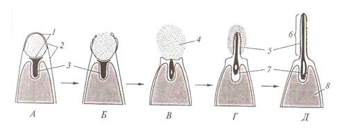 актин; 4 - ферменты акросомы; Г - Д - полимеризация актина и образование